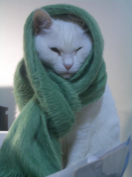 這幾天冷到最高點,在家穿襪子不說,連圍巾都拿來用。顏色詭異的綠圍巾,順手圍在饅頭的脖子上。說脖子好像不太對,應該是整個頭都被包起來了。最令我訝異的是,饅頭竟然沒有反抗,任我圍著不動,甚至還打起了瞌睡,就在我的電腦主機上。饅頭是愛睏了吧。仔細算算,饅頭阿婆來我家也快十年了呢。