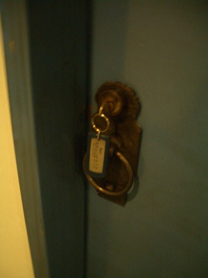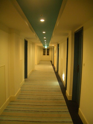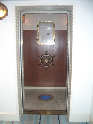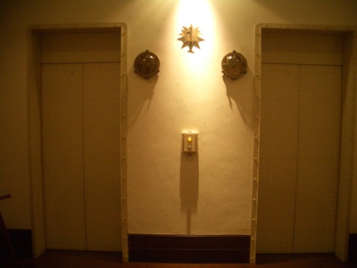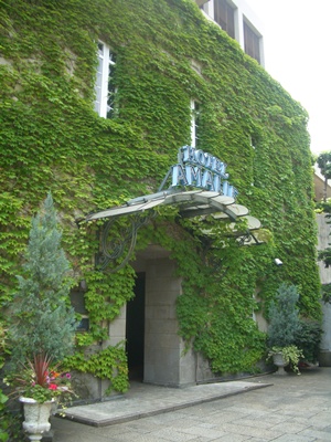 長滿爬牆虎綠意盎然的飯店門口。由於飯店引用自大帆船-Charlotte Amalie的名稱,故整個裝潢、設計也走航海風,光電梯就很有看頭。