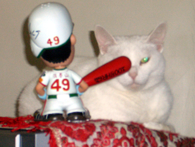 天氣冷,饅頭不是跳上電子鍋,就是電視機或電腦主機窩著,但貓女王不喜歡有人跟她搶地盤,所以四周的桌曆、玩偶,不管放幾次,全被她掃到地上去。客廳電視機上的張泰山人偶也不例外,三不五時就消失到電視機後方。但別忘了泰凸的大棒子。 一棒正好打在饅頭眼上,哈哈哈(冷)。