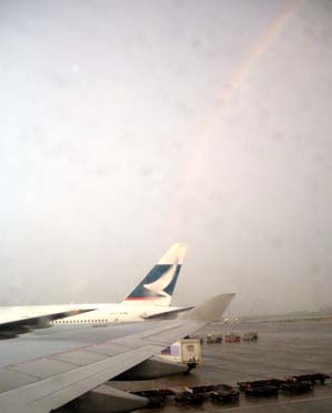 六點多飛機順利降落在桃園中正機場,雖然下著雨,我卻看見一百八十度的大彩虹,當機上旅客忙著下機,我不急不徐地拿出我的相機,透過小小的窗戶,拍下了當時的彩虹。