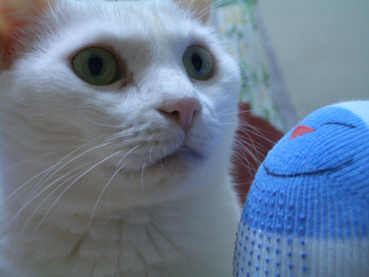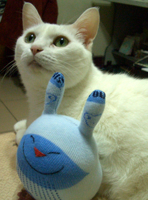 朋友迷上襪子娃娃,看在我贊助舊襪子的份上,送了我一隻。 請叫它"藍色小精靈"。 小精靈的表情很可愛呢。 但,饅頭還是一點興趣都沒有。